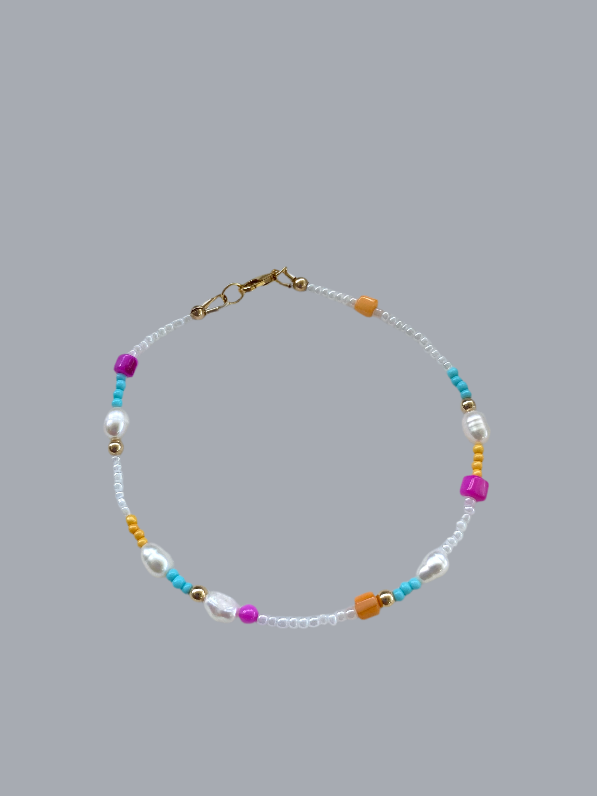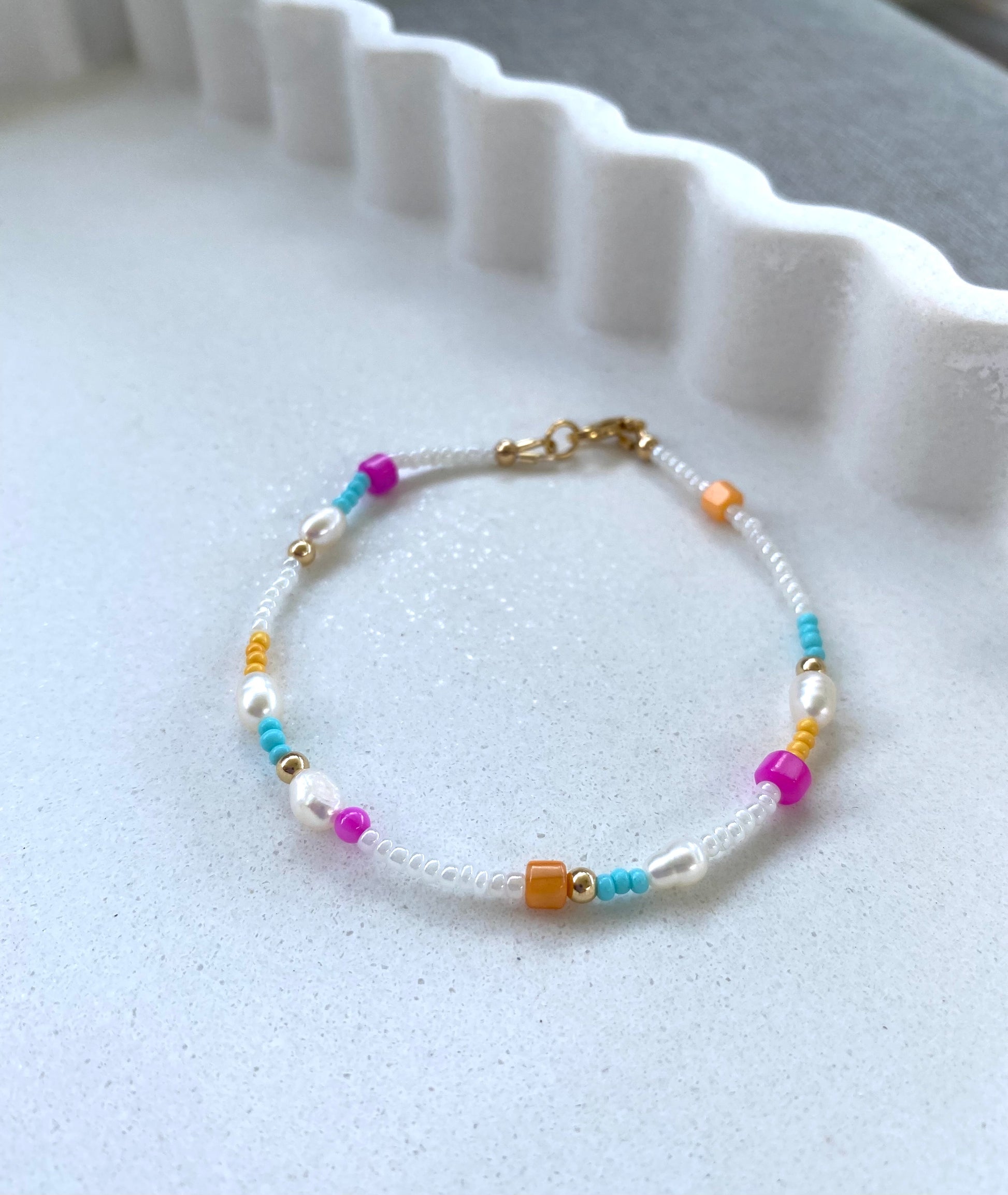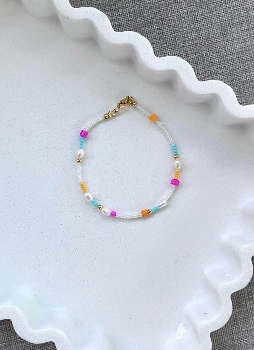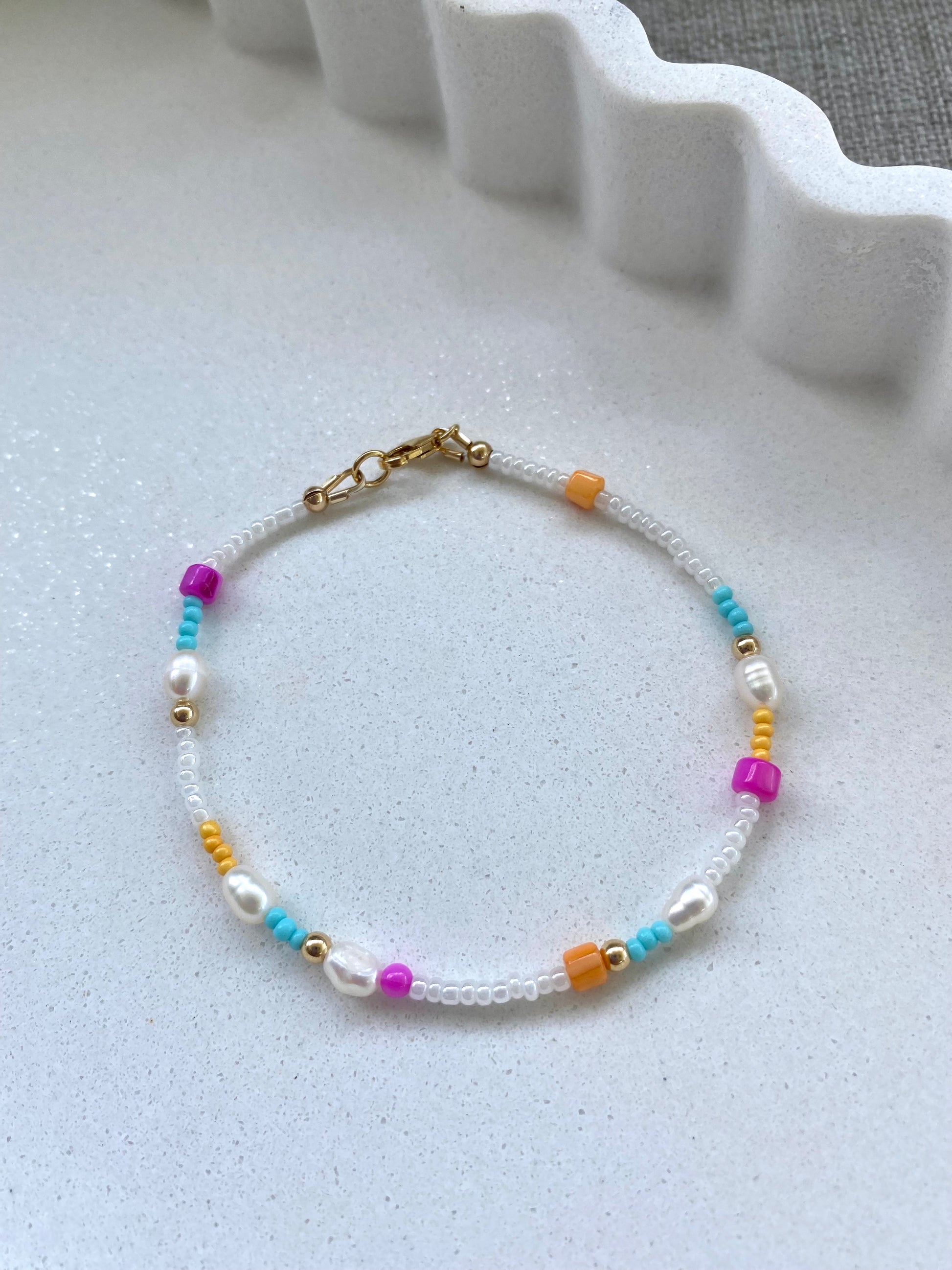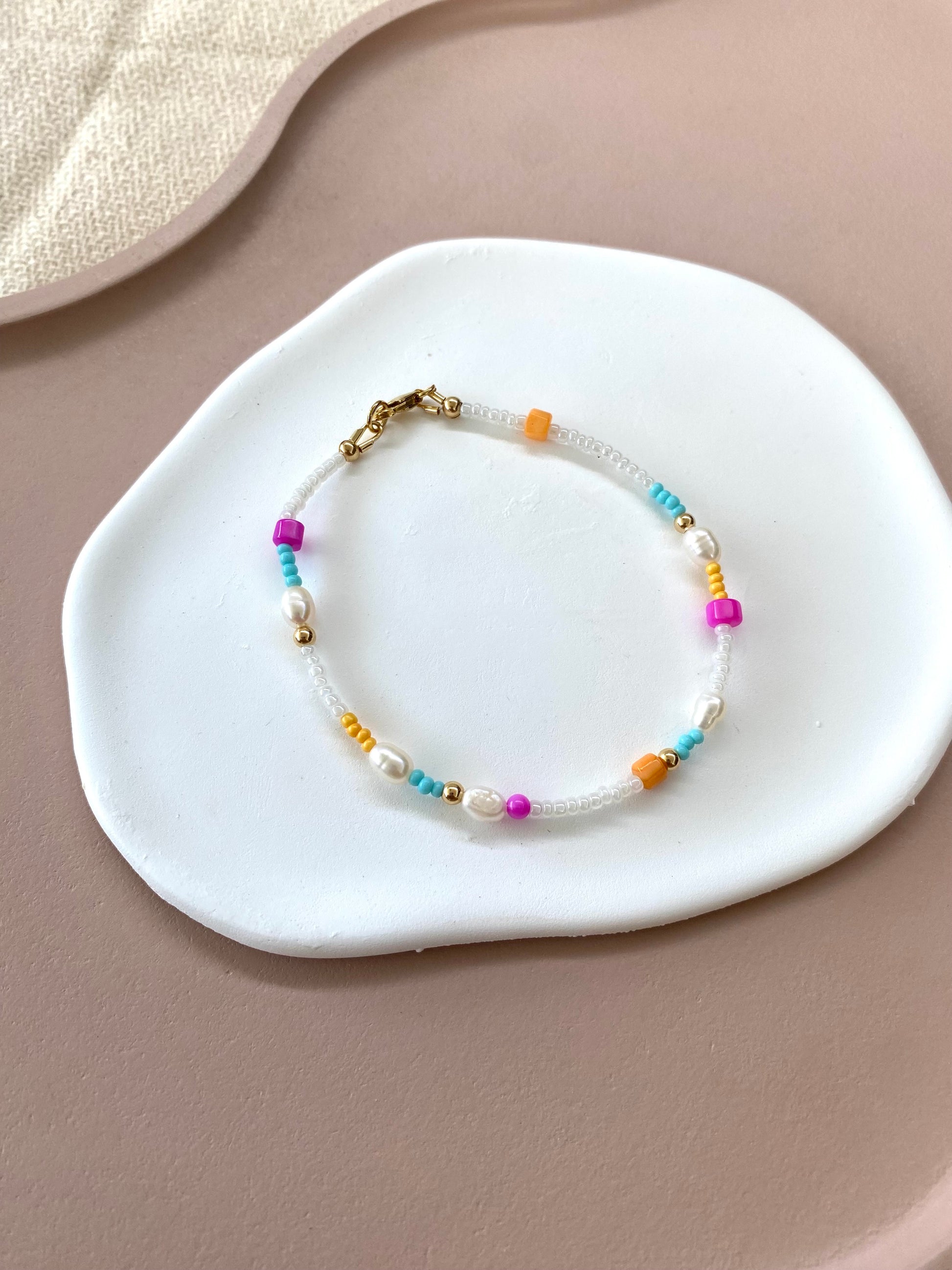 While the hardware on this bracelet is completely waterproof and will never tarnish, please note that the coloured glass beads may fade over time if exposed to water. To preserve the vibrancy of the beads, we recommend removing the bracelet before swimming, bathing, or engaging in water-related activities.