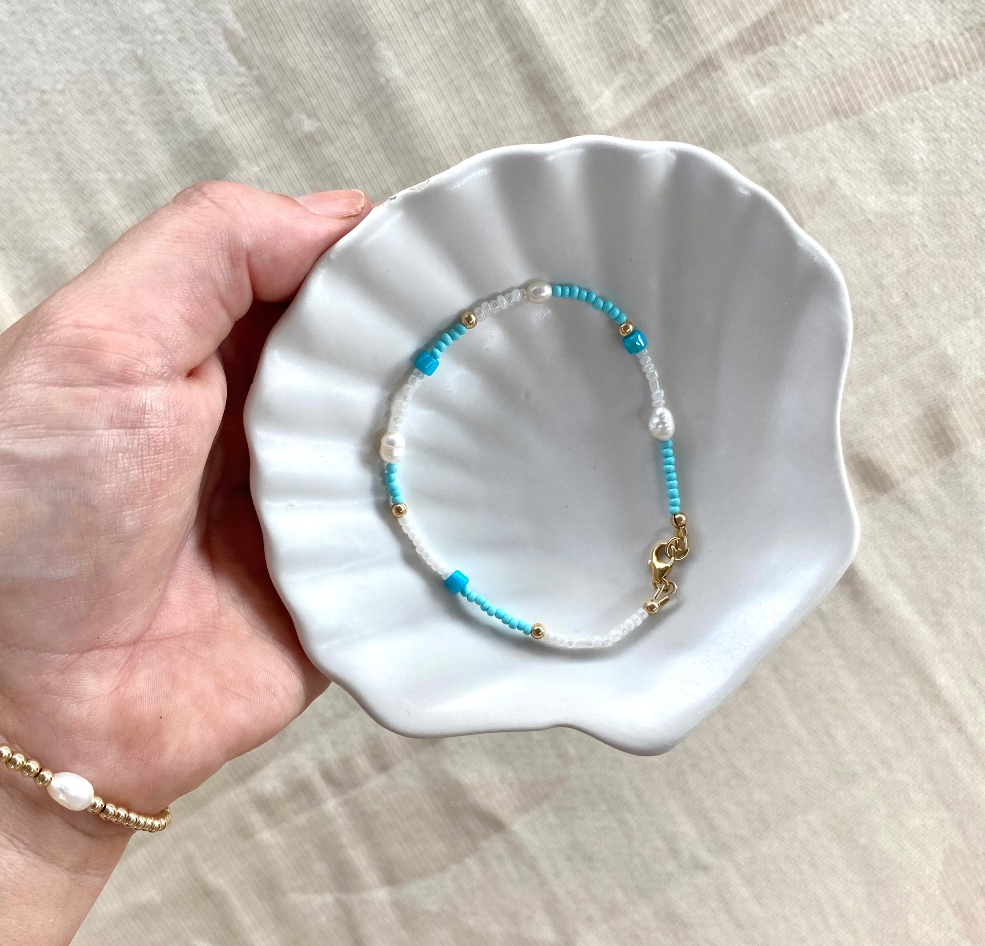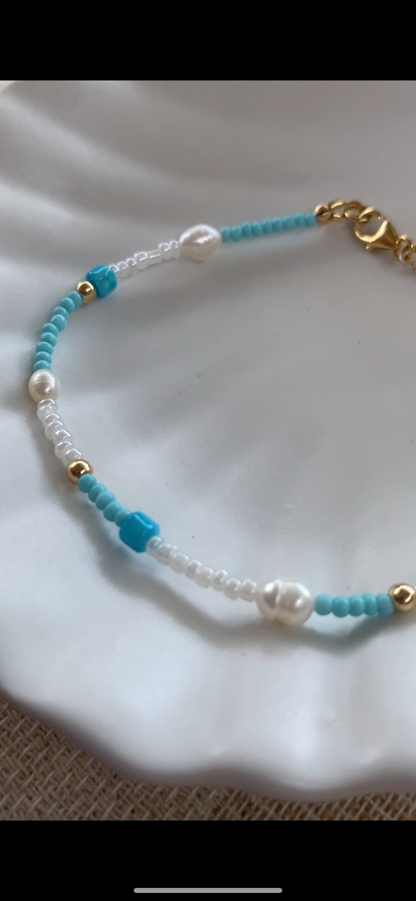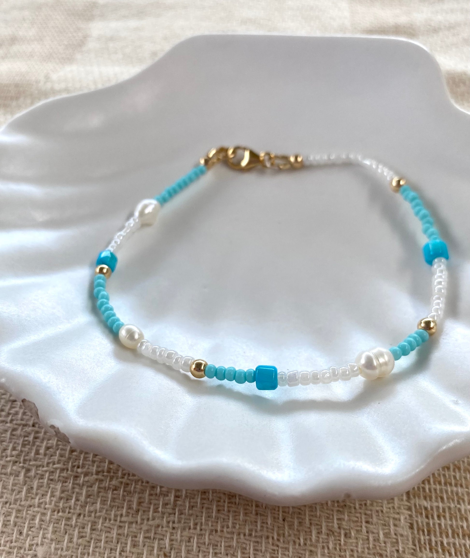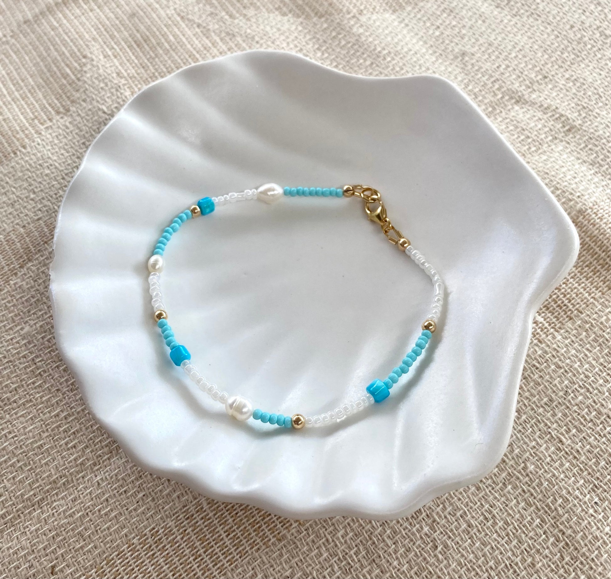 While the hardware on this bracelet is completely waterproof and will never tarnish, please note that the coloured glass beads may fade over time if exposed to water. To preserve the vibrancy of the beads, we recommend removing the bracelet before swimming, bathing, or engaging in water-related activities.