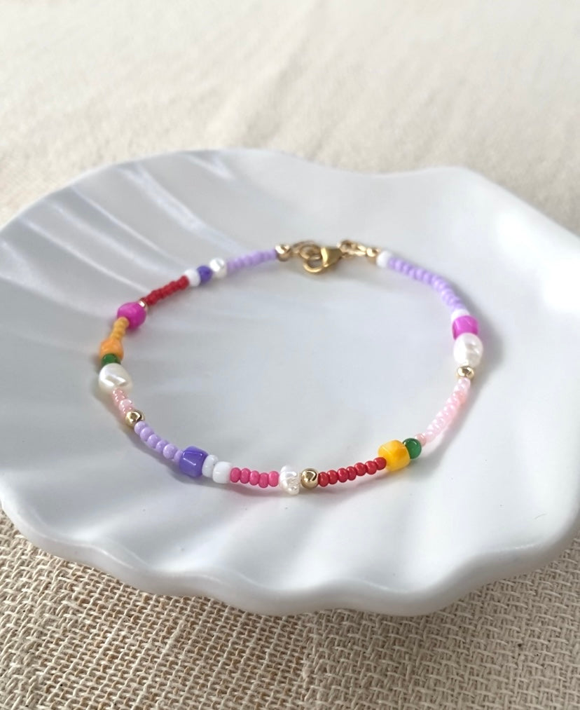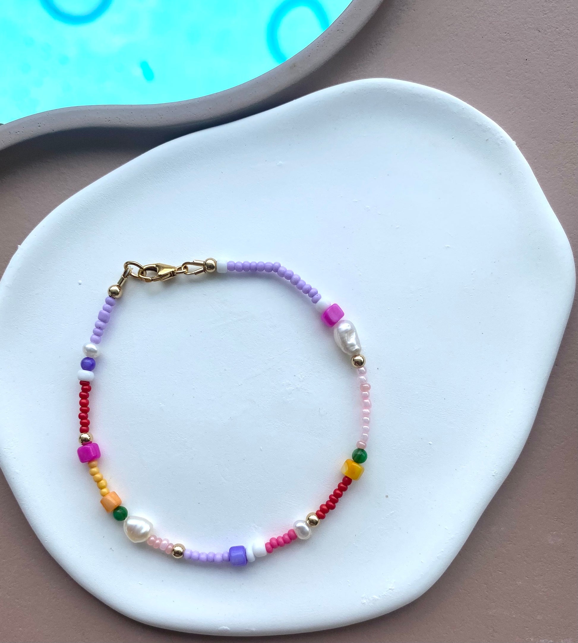 While the hardware on this bracelet is completely waterproof and will never tarnish, please note that the coloured glass beads may fade over time if exposed to water. To preserve the vibrancy of the beads, we recommend removing the bracelet before swimming, bathing, or engaging in water-related activities.